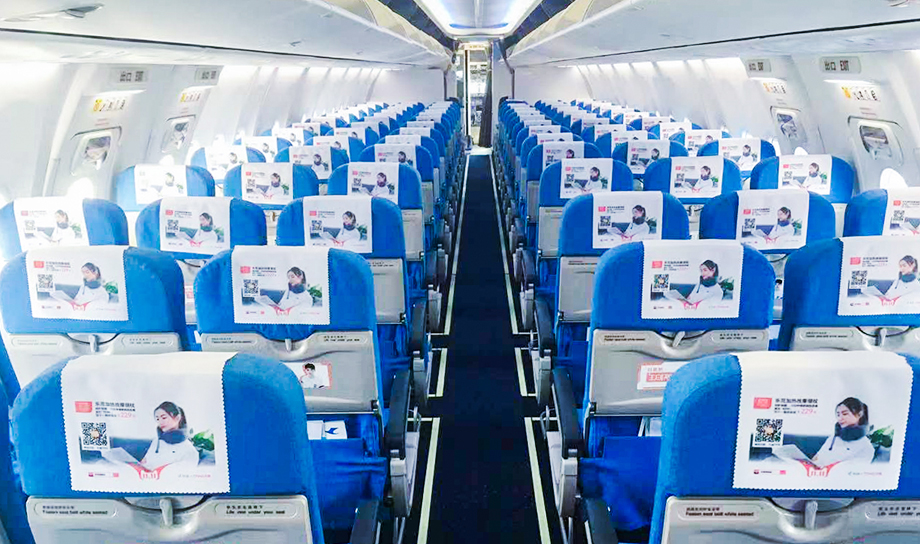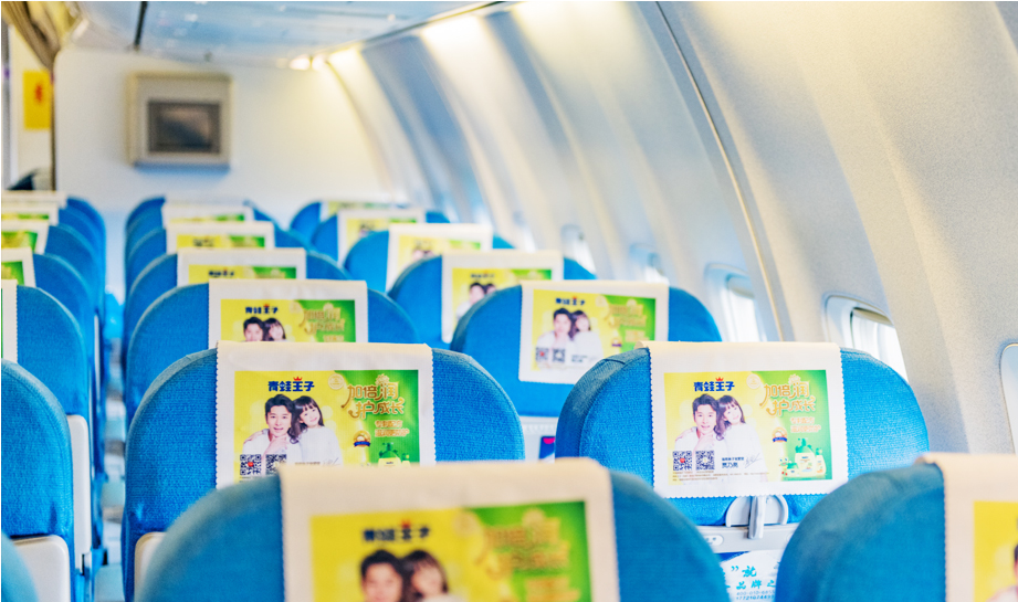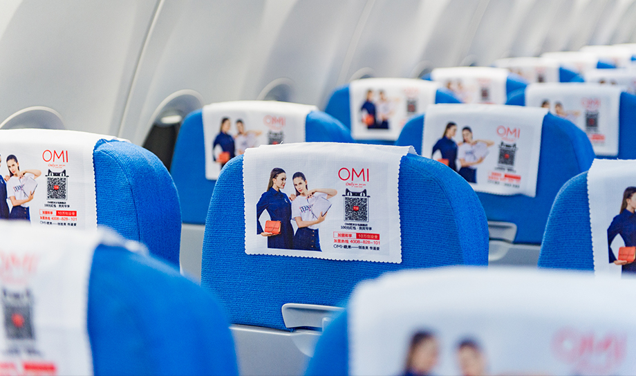 一進(jìn)入機(jī)艙,每個(gè)座椅上醒目統(tǒng)一的頭片廣告,全艙集中呈現(xiàn),營(yíng)造出一種沖擊力極強(qiáng)的視覺